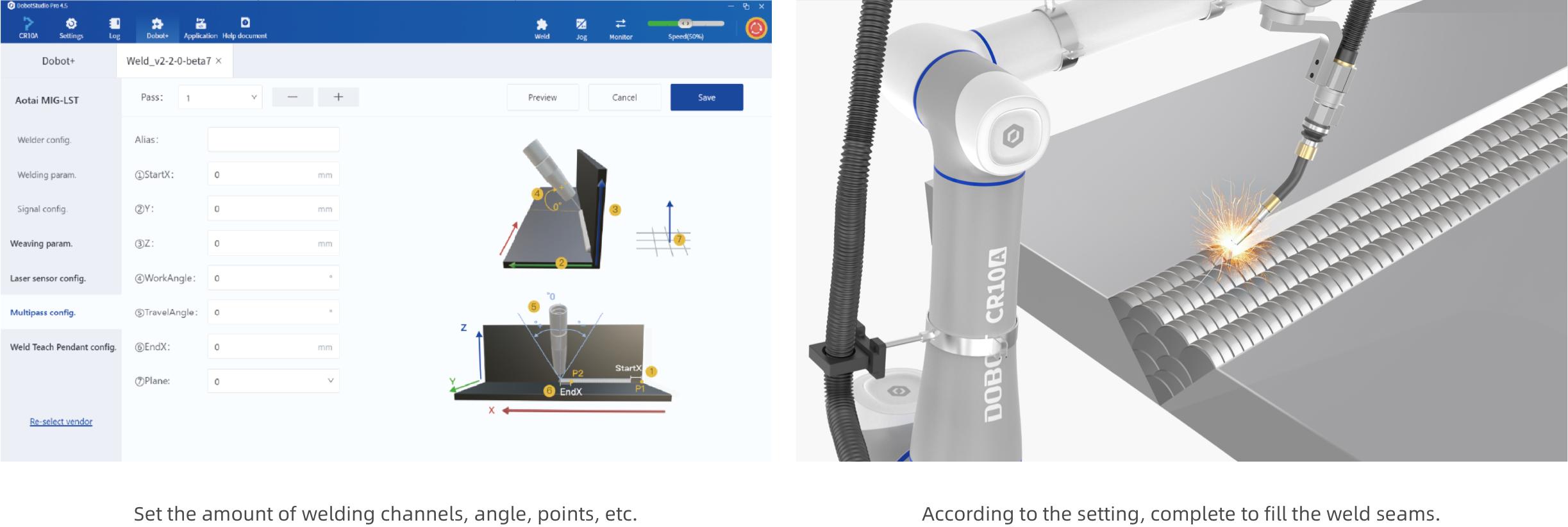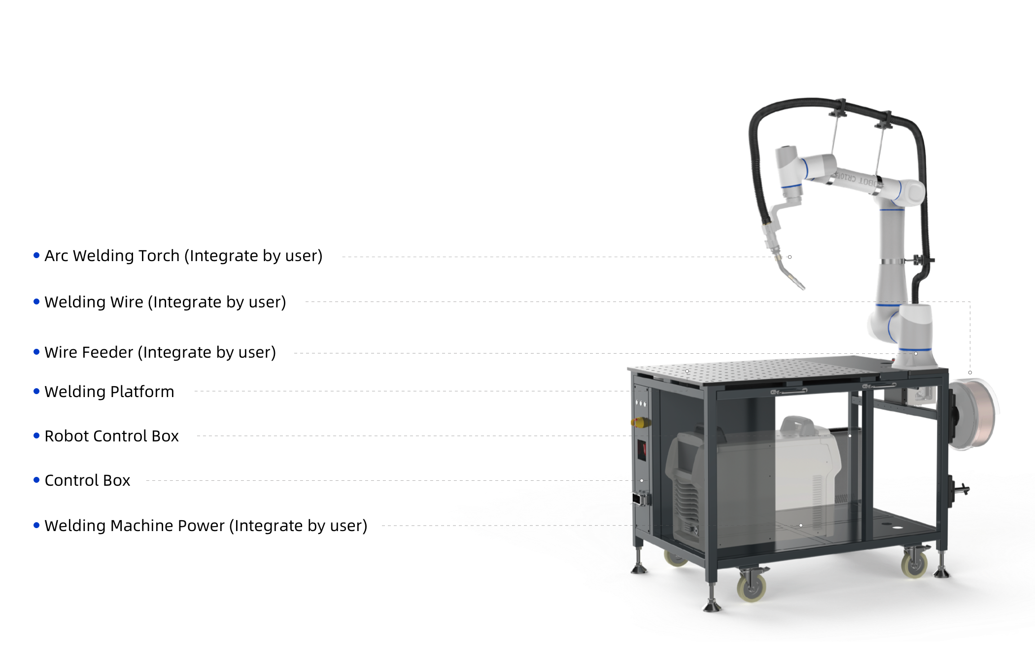 La plataforma utiliza Dobot CR10A Cobot como mecanismo de movimiento. Son fáciles de configurar y flexibles para mover, con orificios roscados distribuidos uniformemente en toda la superficie para fijar de forma segura el cobot en cualquier posición. Funciona con varias máquinas de soldar de las principales marcas del mundo, y con Dobot Welding Process Package, los usuarios pueden personalizar rápidamente esquemas de soldadura para producciones pequeñas y diversas.